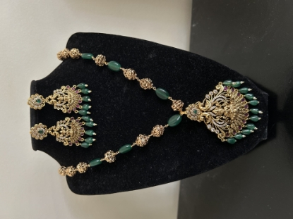 Green emerald and rice pearl hanging necklace set...it came with goddess pendant ...Just worn it once ..