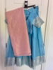 Baby blue mangalgiri lehenga with pink tissue dupatta. Adjustable buttons available for skirt 34-30 inches, length 40 inches and blouse chest 36 inches with extra 2 inch margin. Worn only once for an hour.